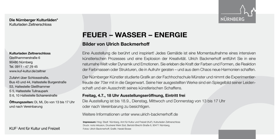 Einzelausstellung "FEUER, WASSER, ENERGIE "im Kulturladen Zeltnerschloss, Nürnberg - 4. Juli - 18. Sept. 2025