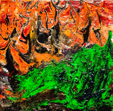 Feuer hat seine Faszination als wohltuender Wärmespender und zugleich wütendes, ungezügeltes und zerstörerisches Element aus den Tiefen des Erdinneren. - eingefangen in einer koloristischen Expression der impulsiven Farbgebung. Das Thema "Feuer und Flamme" behandelt vulkanische Eruptionen auslaufend in glühende Lavaströme.